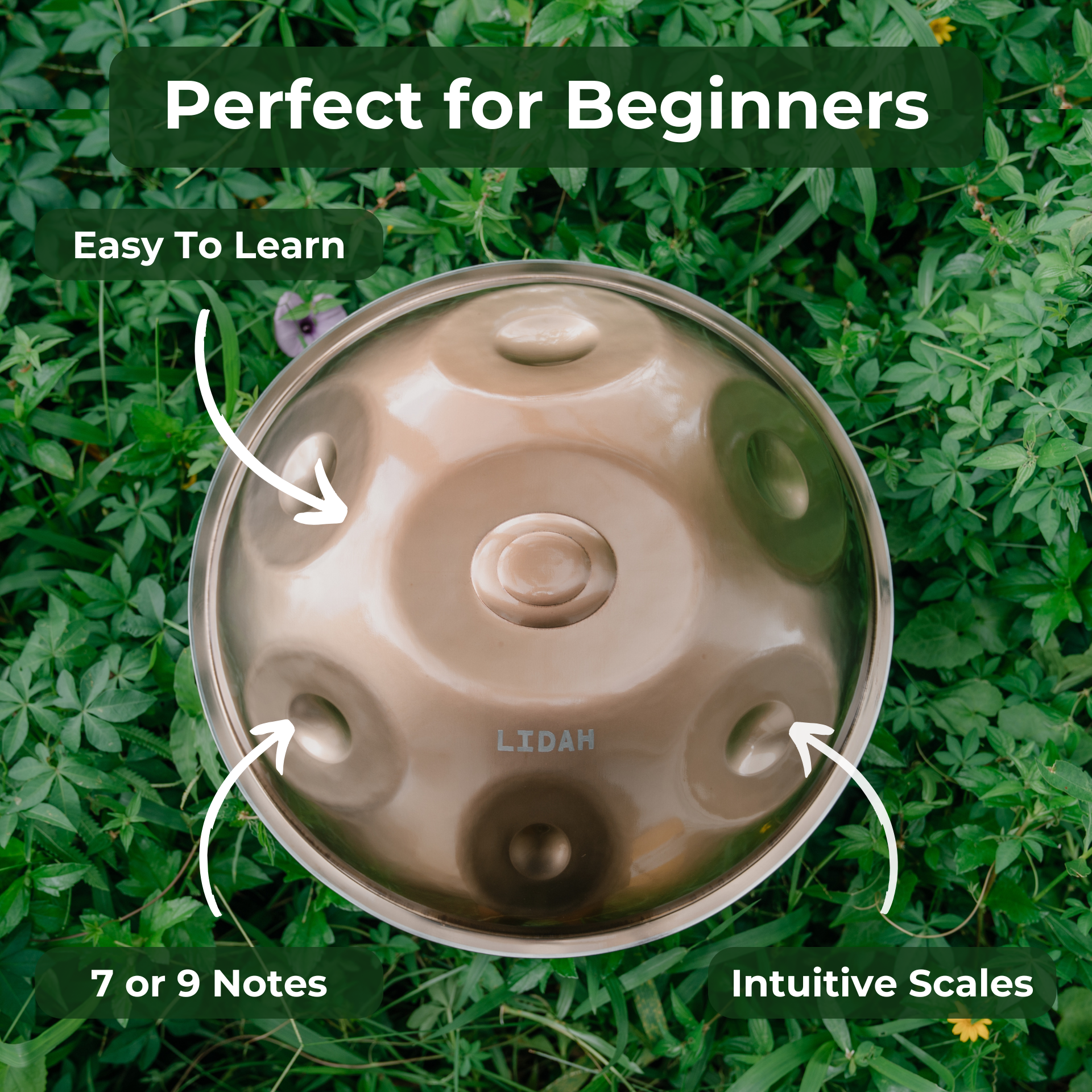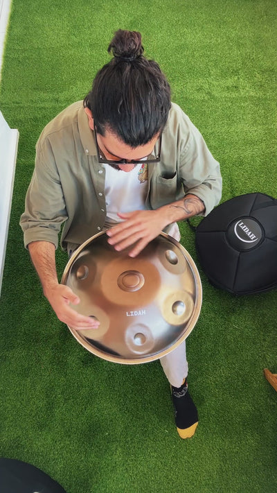 Les mini handpans ont un diamètre de 43 cm et sont disponibles avec 7 ou 9 notes. Ils sont légers, faciles à jouer et parfaits pour les débutants, les joueurs de petite taille ou toute personne recherchant un instrument portable sans sacrifier la chaleur du son et la résonance.