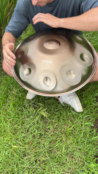 - Mini Handpan (43 cm) → Compact, licht en makkelijk te bespelen. Gemaakt van roestvrij staal met een heldere, sprankelende klank en lange resonantie. Perfect voor kleinere spelers, reizen of wie op zoek is naar een draagbare optie—zonder in te leveren op warmte en geluid. Varianten beschikbaar met 7 of 9 tonen.