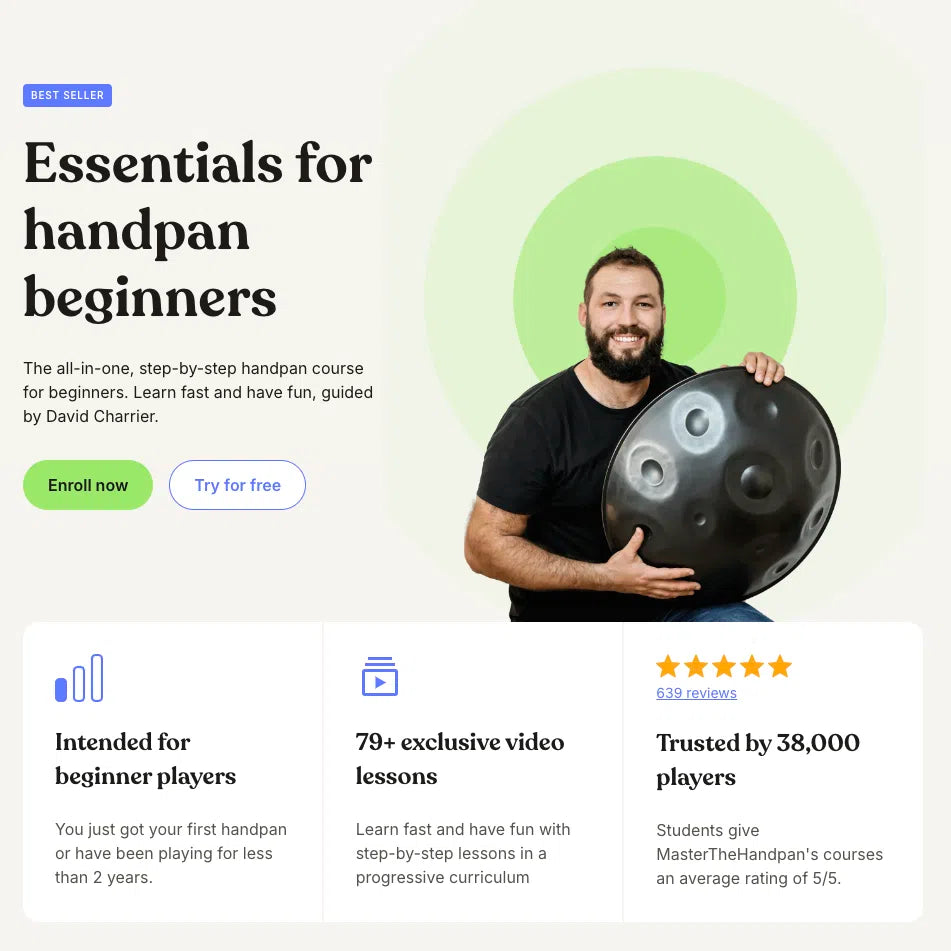 - Gratis levenslange toegang tot Master the Handpan (70+ online lessen)